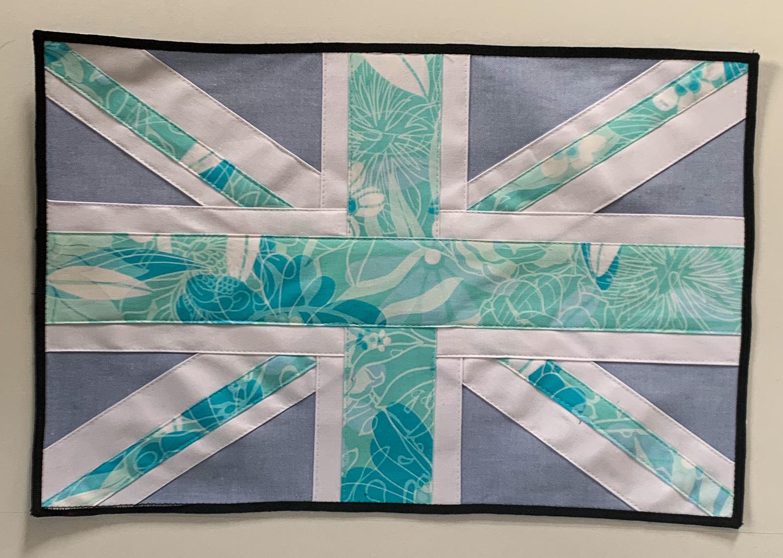 A traditional take on the iconic flag using a floral pattern material in the design, in blue pink and white.